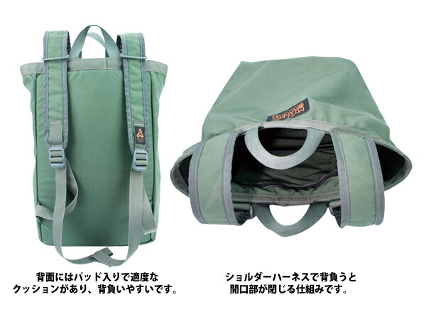 開口部は広いので通常は荷物の出し入れが簡単ですが、バックパックとして背負う時はバッグ上部が閉じる構造なので便利です。