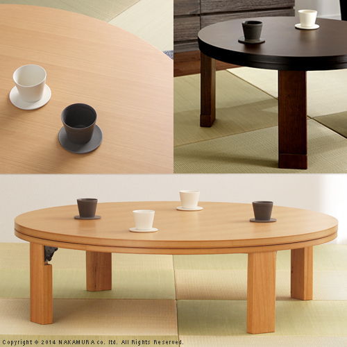 商品について:楢天然木の木目が美しい日本製の円形折れ脚こたつ。